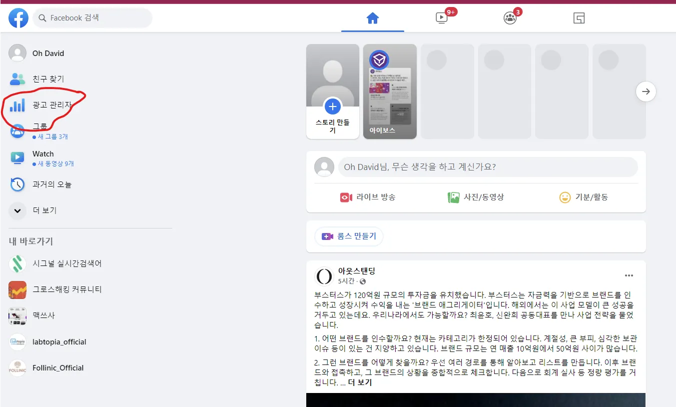 페이스북 계정 접근 → 왼쪽 메뉴→ 광고 관리자 클릭
