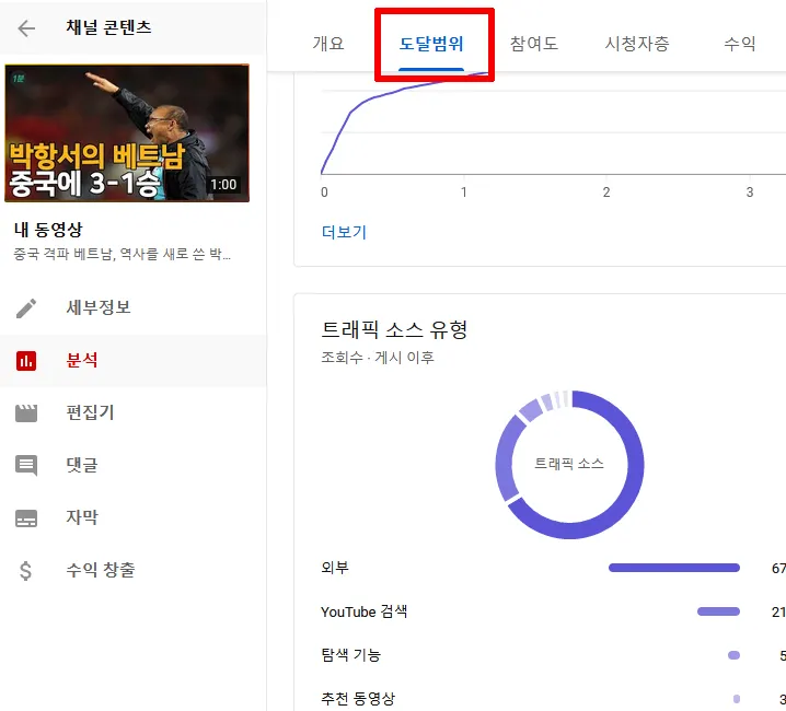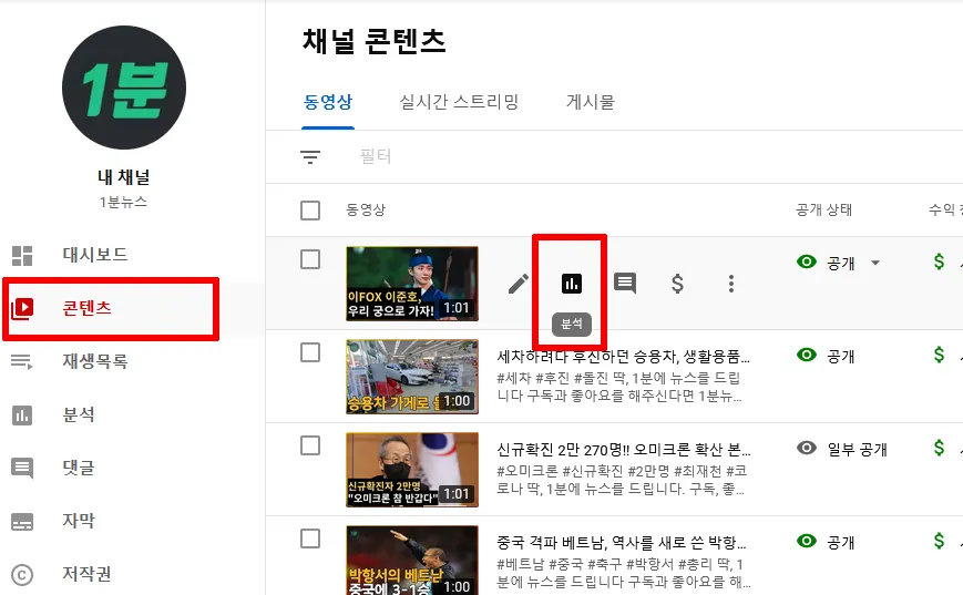 유튜브 관리자페이지 ⇒ 콘텐츠 ⇒ 분석버튼 클릭