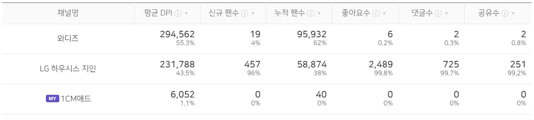 - 각 SNS 채널에서 가지고 있는 고유 데이터값을 수치화 하여 보여줌