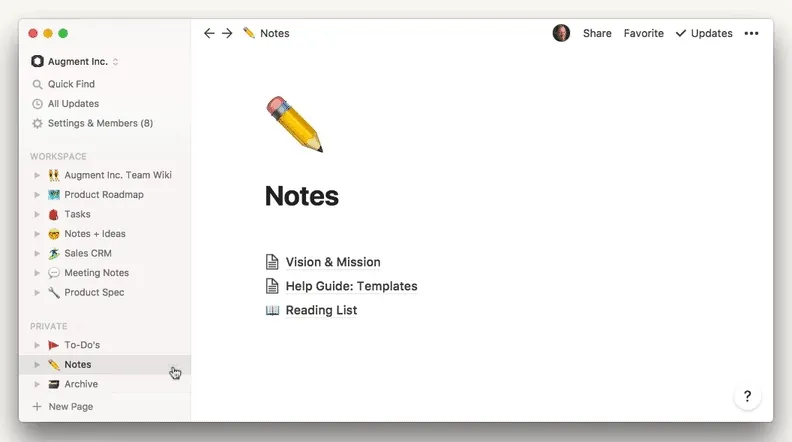 Notion 페이지는 두 가지 기본 섹션으로 구성됩니다. i) 누구나 참여할 수 있는 팀의 Workspace 와 ii) 개인적으로 작업하는 Private 으로 말이죠. 이 개인 공간은 사용자가 별도로 지정하지 않은 다른 사용자가 액세스할 수 없습니다.