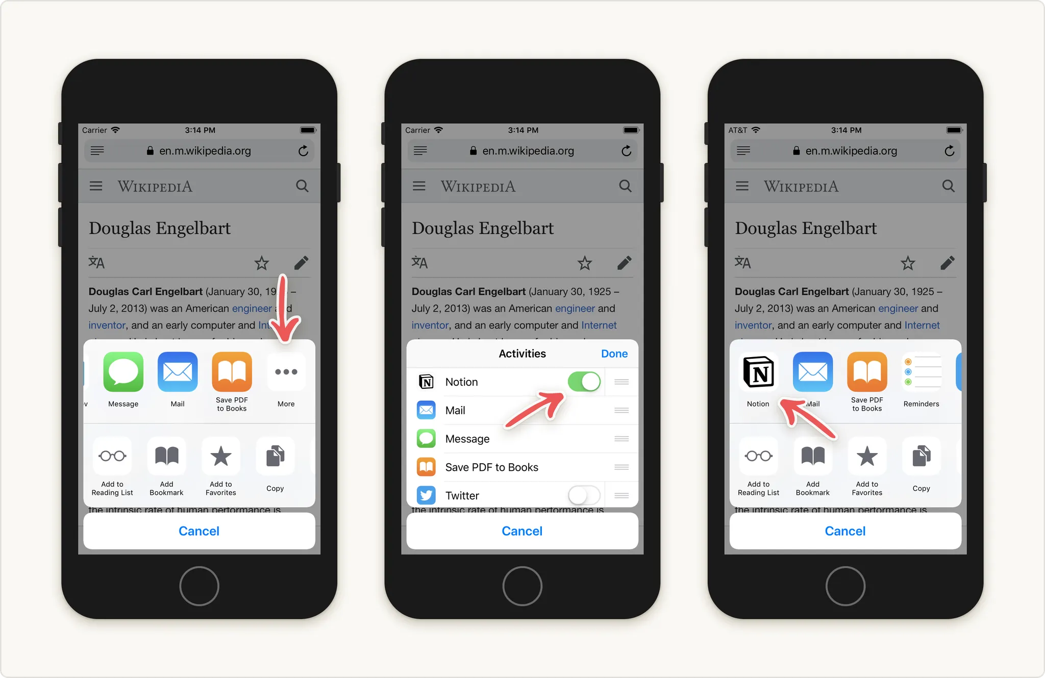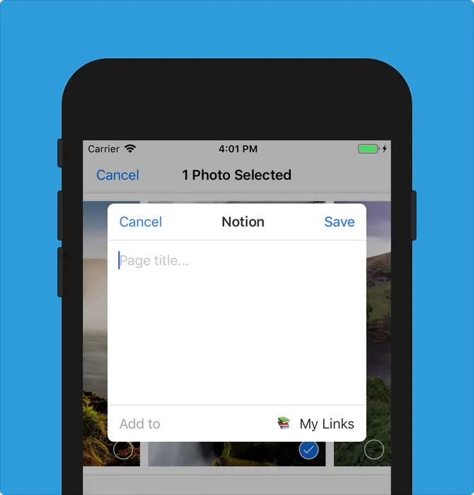 Tip! 기사를 클립핑하는 것 외에도 스마트폰의 로컬 파일과 사진을 Notion에 저장할 수 있습니다! 예를 들어 iOS 기기에서 이미지를 추가하는 방법은 다음과 같습니다.