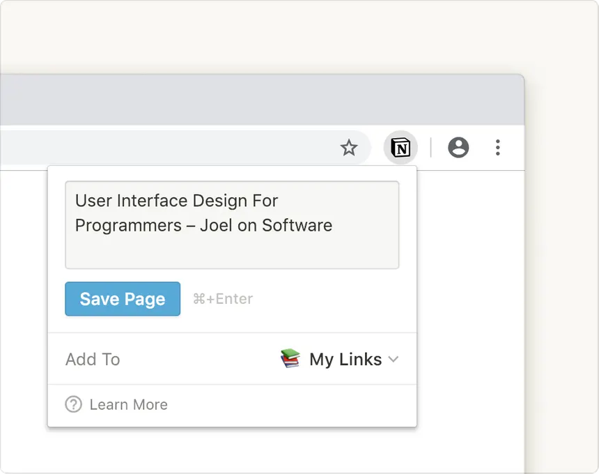 페이지 혹은 데이터베이스를 선택한 뒤 Save Page또는 cmd/ctrl + Enter를 누르시면 클리핑이 완료 됩니다.