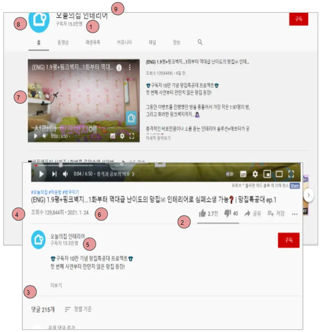 유튜브 페이지 화면에서 크롤링 하여 가지고 올 데이터를 정리하였으며 해당 데이터에 대한 파라미터 정의
