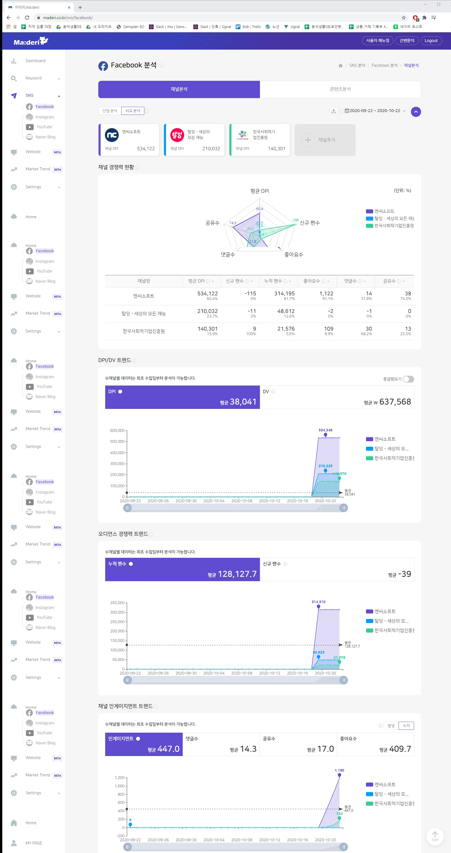 채널분석 : 사용자가 지정한 채널에 대한 시간대별 종합점수, 팬, 좋아요, 댓글등의 데이터를 시간순서로 정보를 제공하여 해당 기업의 현재 채널의 상태를 알려준다.