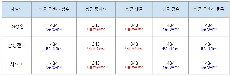 유튜브 : 평균 콘텐츠점수, 평균 좋아요, 평균 댓글, 평균 조회수, 평균 콘텐츠 등록