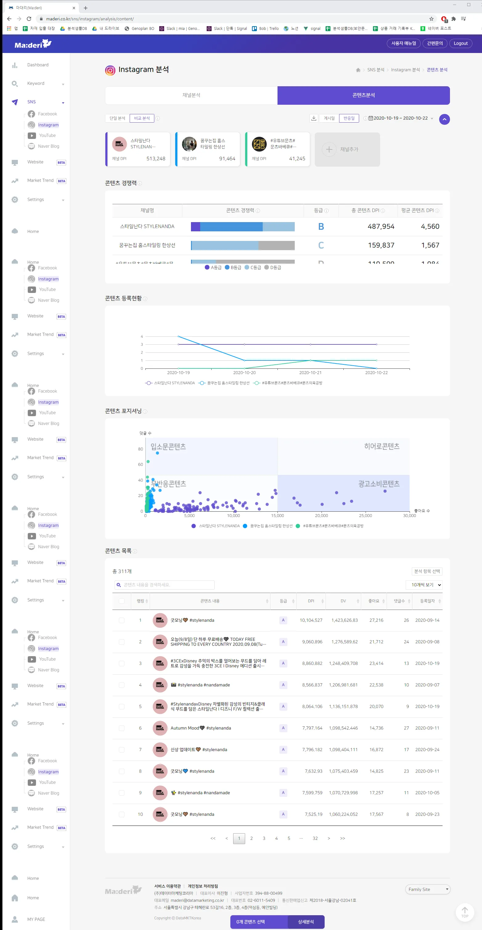 현재 운영하고 있는 SNS채널 뿐만아니라 경쟁사의 SNS 채널 운영 현황을 확인할 수 있다