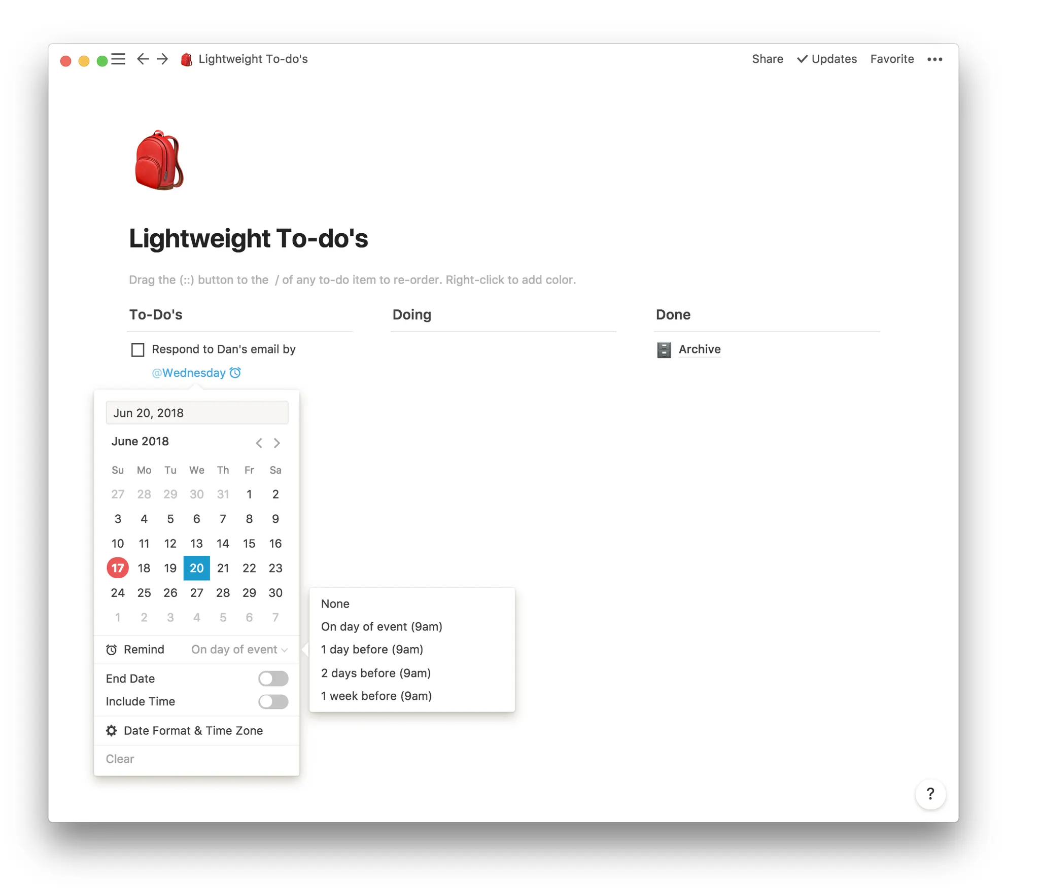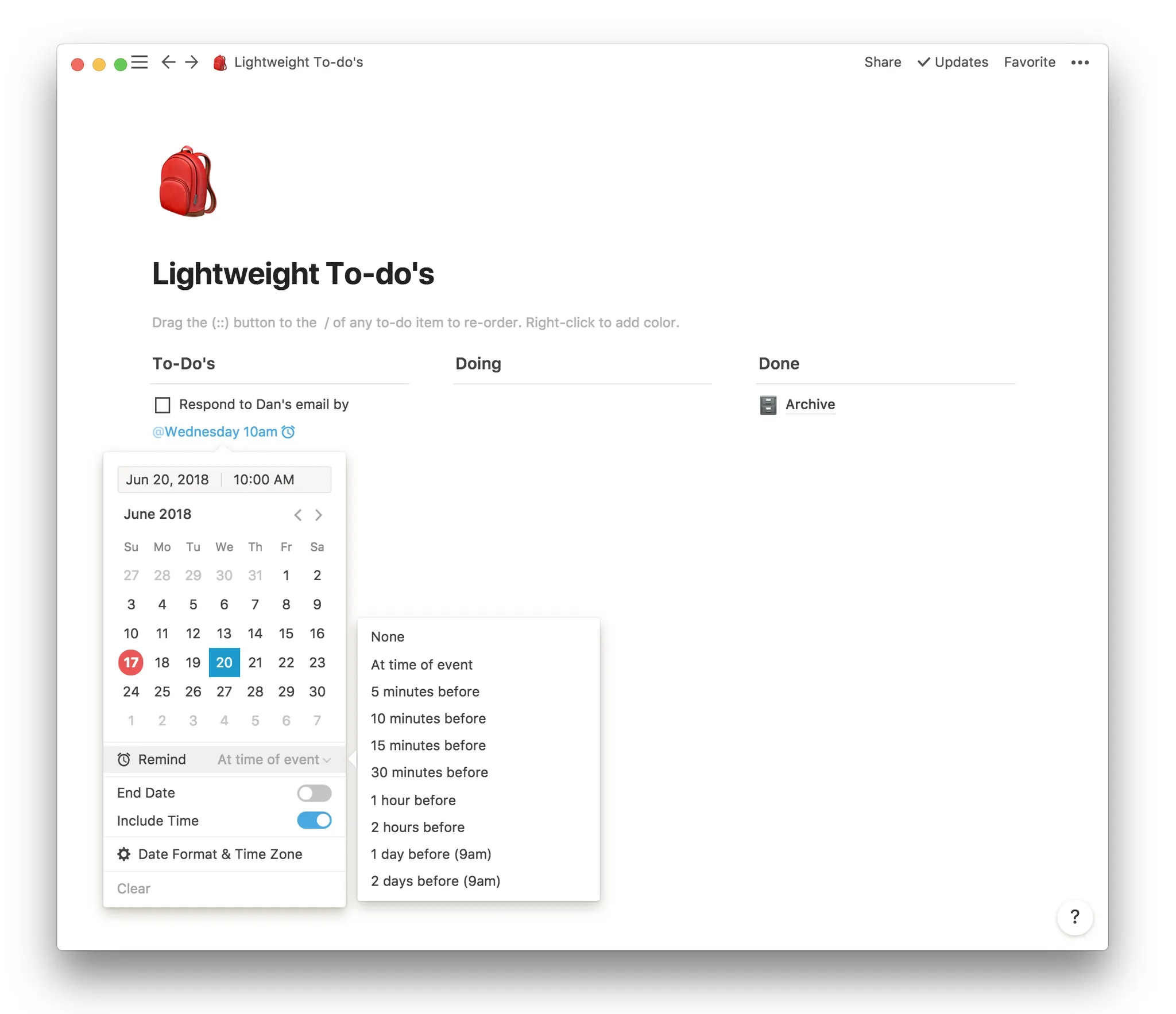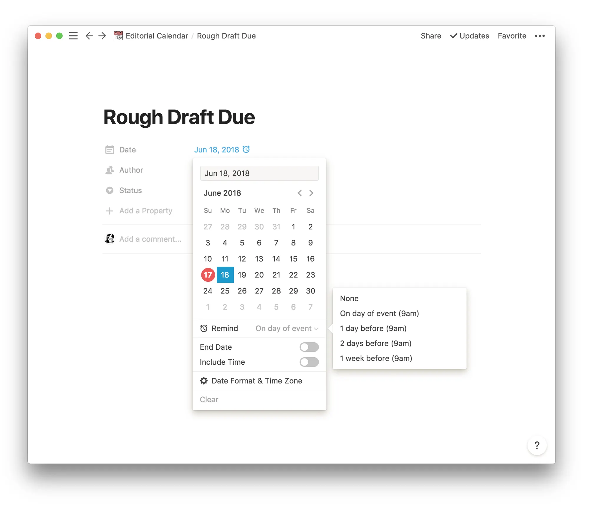 데이터베이스(표, 보드뷰, 캘린더)에서 작업하는 경우 "Date"속성을 사용하여 특정 이벤트 / 행 / 카드에 미리 알림을 추가할 수 있습니다. 미리 알림을 설정하면, 상단의 인라인 날짜 미리 알림과 동일한 방식으로 작동합니다.