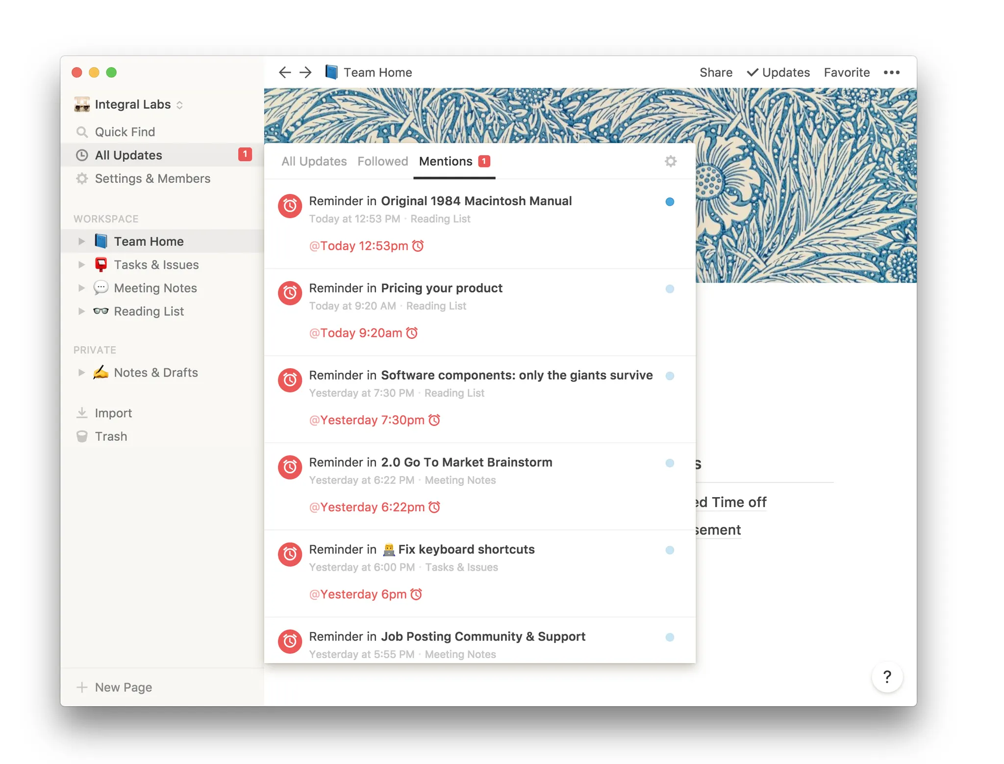 리마인더 알림은 리마인더로 설정한 시간 10초 내외로 "All Updates"에 빨간색 아이콘으로 표시됩니다. 데스크톱 앱에서 작업 중이며 Notion창을 열어 놓은 경우 Windows 푸시 알림으로 표시됩니다.