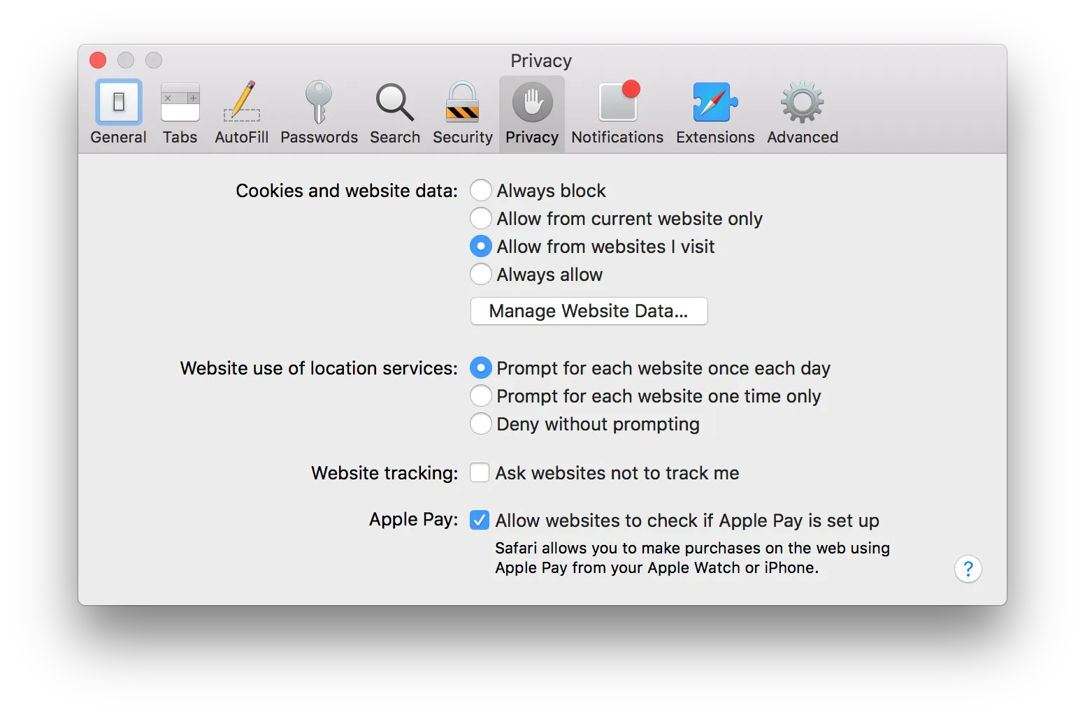 'Privacy'탭에서 'Manage Website Data...'를 선택합니다.