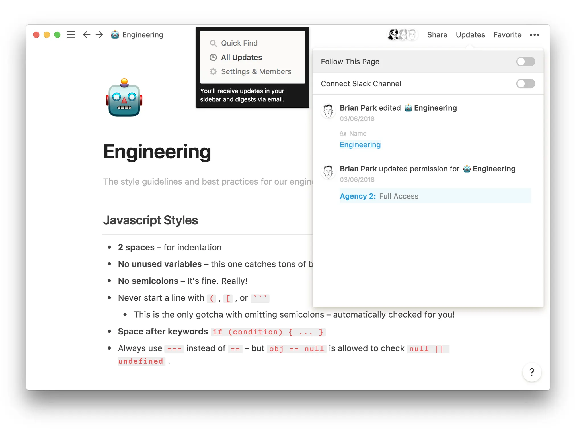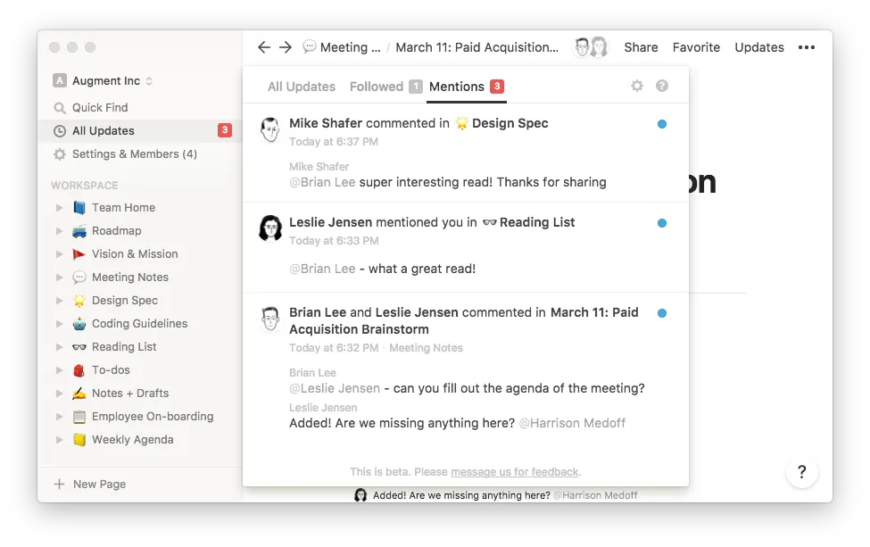 코멘트에 대한 알림은 @mentions와 동일한 방식으로 작동합니다. 페이지에 코멘트를 달면 해당 페이지 관련된 모든 사용자에게 알림이 전송됩니다. 코멘트 내에서 다른 사람을 @mention할 수도 있습니다!