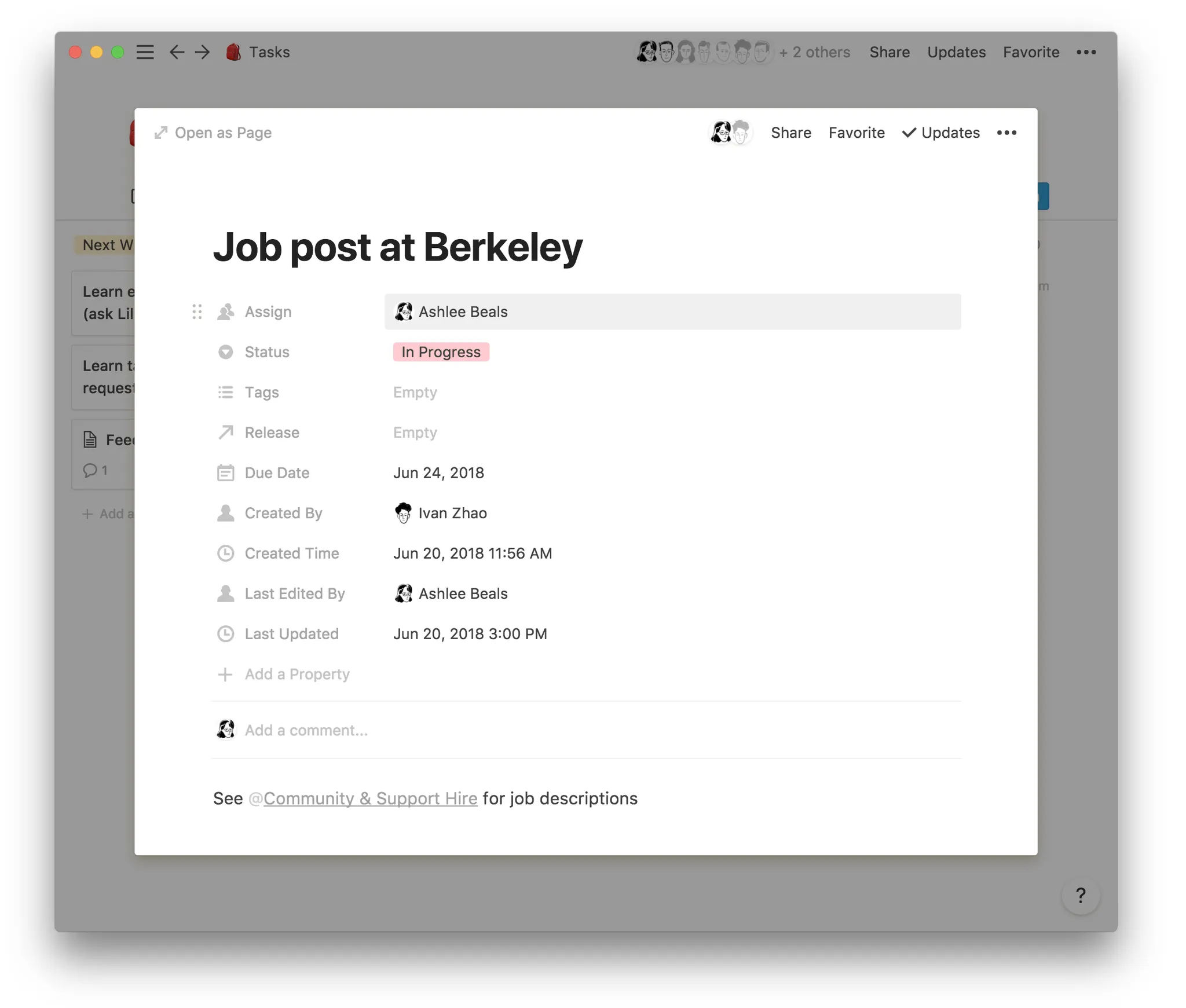 데이터베이스의 "Person" 속성을 사용하여 사용자를 특정 페이지에 추가할 수도 있습니다. 특정 페이지에 Person 속성을 추가하는 것으로 아래 예제처럼 사이드바의 "All Updates"에서 이에 대한 알림을 받게 됩니다.