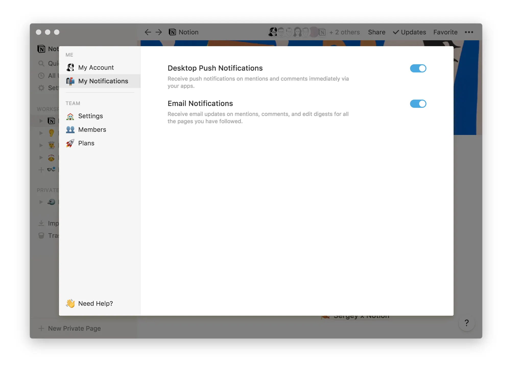 Notion이 백그라운드에서 실행되는 것이 아닌 현재 사용하고 있는 상태에서만 데스크톱 푸시 알림이 작동합니다. 그래도 안된다면 "Desktop Push Notifications"이 켜져 있는지 확인해보세요.