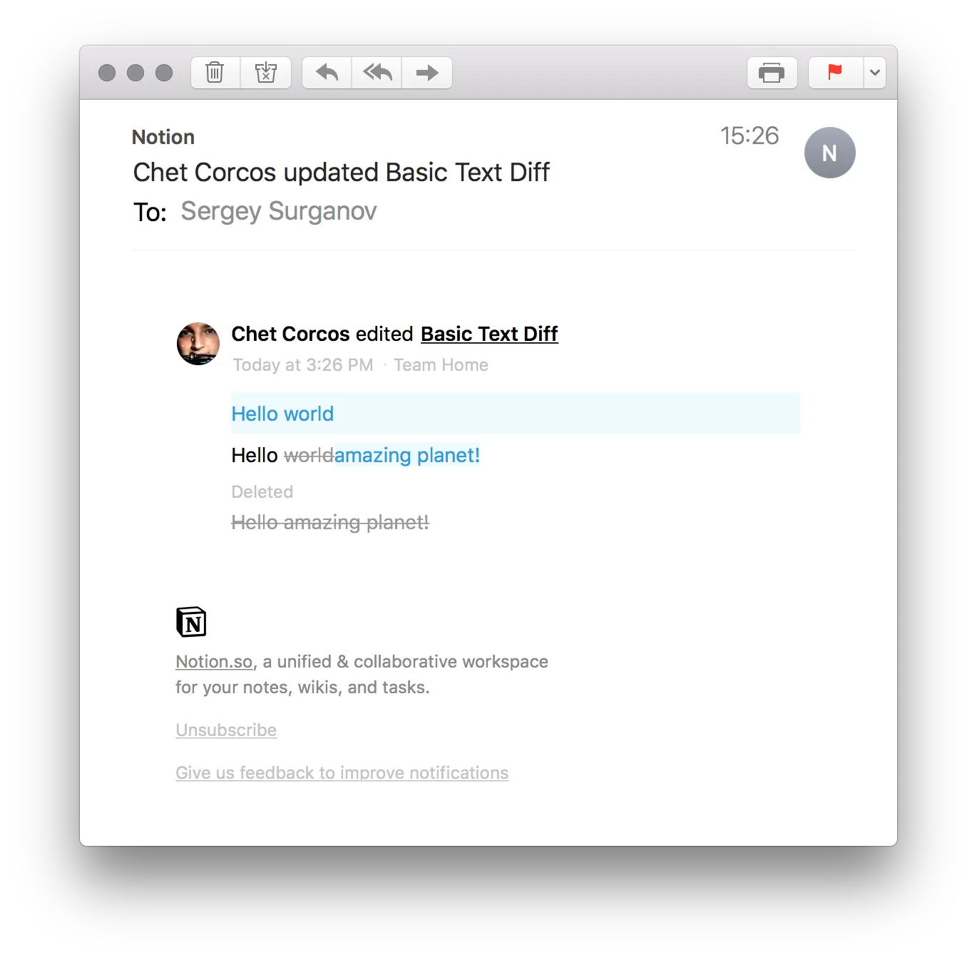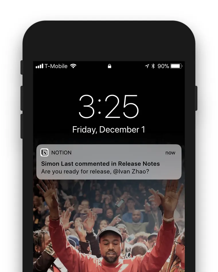 알림이 생성될 때 사용자가 알림에서 전혀 작동하지 않는 경우 10초 후에 모바일 푸시 알림 또는 이메일이 자동으로 전송됩니다. 5분 넘게 푸시를 읽지 않은 경우, Notion은 모바일 푸시 알림이나 이메일을 통해 재알림을 보냅니다.